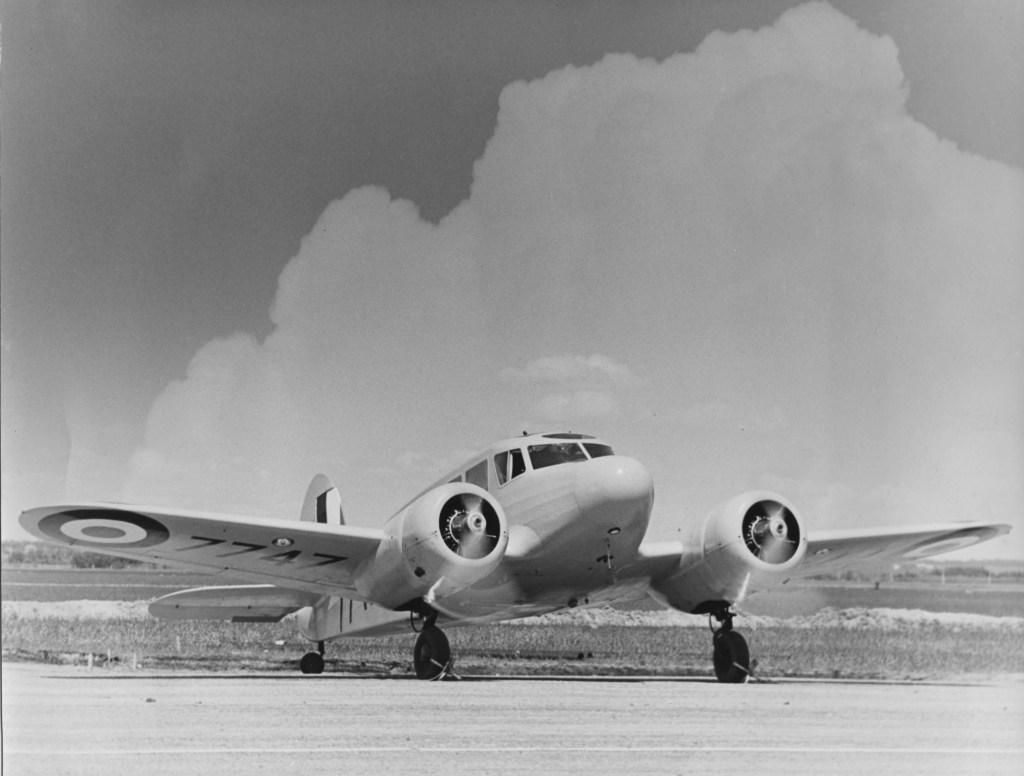 In 1939, the Cessna T50 first flew as a light transport and was soon converted for military use. In the USA it was known as the Bobcat, but the RCAF named it the Crane. Early in the war, there was a shortage of training aircraft, so the RCAF ordered Cessna Cranes. They were inexpensive, reliable, and relatively easy to fly so they filled the need for a twin-engine trainer nicely. Many pilots training on Cranes were destined to become bomber pilots. The Cranes had retractable landing gear, wood wings, and a fuselage of steel tubing, most of the airplane had a fabric cove