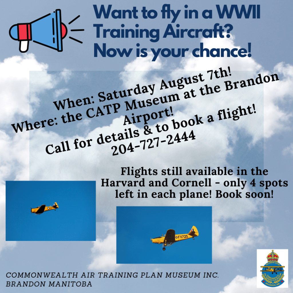This coming Saturday, August 7, we are giving rides in our vintage aircraft. We have 4 or 5 spots left in each of the Harvard and Cornell – sorry but the Tiger Moth is fully booked for this time. Call the museum for details and to book a flight!