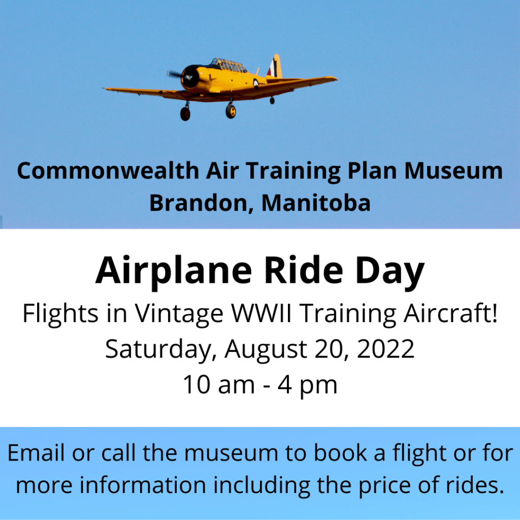 Coming up on Saturday August 20 are 2 events not to be missed! First up is a Flight Day! You can purchase a ride in one of our vintage WWII training aircraft from 10 am to 4 pm. Just call or email the museum to book a flight or obtain more information – believe me, a flight in one of these is an amazing experience and a chance to experience an important part of Canadian history!