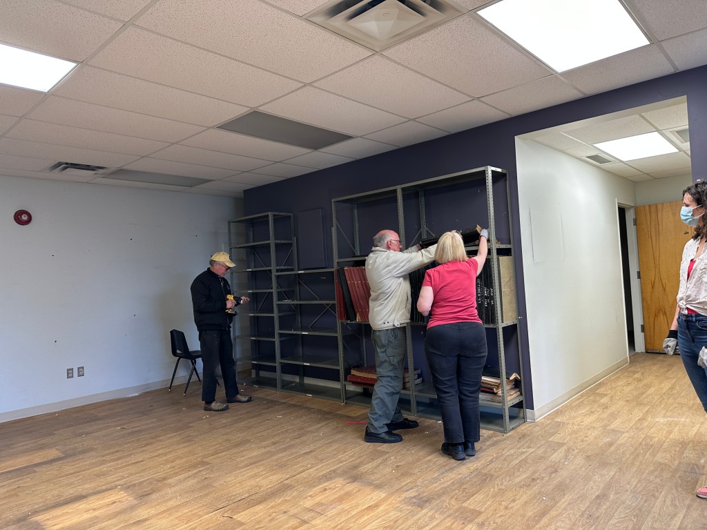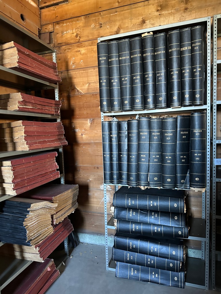 Back in the first week of October 2023, I had been talking with the Brandon General Museum and Archives, and Matt Goerzen of the Brandon Sun about saving the Brandon Sun’s Archives. The Brandon Sun’s new location does not have space for the original newspapers, and while the Legislative Library has expressed interest the archives was soon to go to the landfill. Our Archivist, Judith, and myself had taken a look and felt we could at least save 1900 to 1950, this would cover WWI and WWII. The Brandon Sun also provided the shelving to store the newspapers. At the time, depending on the number of volunteers we felt we may be able to save more, perhaps volumes which include our museum’s history. Opportunities like this do not happen often and it would be been a shame to see Brandon’s history go to the landfill. In the end we had a great crew of volunteers. It was decided that temporarily we would use a space in the east lean-to of the hangar. Certainly not a permanent home but at least the opportunity to keep it safe, and the resulting time will hopefully mean a permanent home. In the end we saved it all, something we can all be happy about!