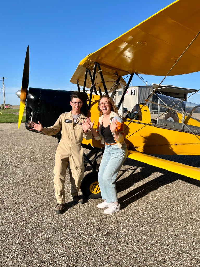 Now that my idea was intact, the Bell TV producer gave me the thumbs up, I was good to go! There was a A LOT of moving parts to this show. I was going to host, write, direct, find my experts, “hire” two classmates as camera people, fly a drone and then edit. All while trying to make it look like it was all filmed in one day, aka, I must get this done before it snows, and it can snow any minute kind of pressure. First thing I did was search for my experts. I needed to find an adventure, good food, and a historical site in Brandon. For historical site, I immediately thought of the beautiful biplane at the Commonwealth Air Training Plan Museum that I remembered seeing a few years ago in their hangar. I remember being shocked that you could book a flight in it! This brings me back to my original point of the show, flying this plane has always been a possibility but I have never done it. But if I was traveling in some European country as a tourist and saw that you could have a ride in a biplane, well, I would 100% do it. So, I paid the museum a visit to see if they wanted to be a part of the show.