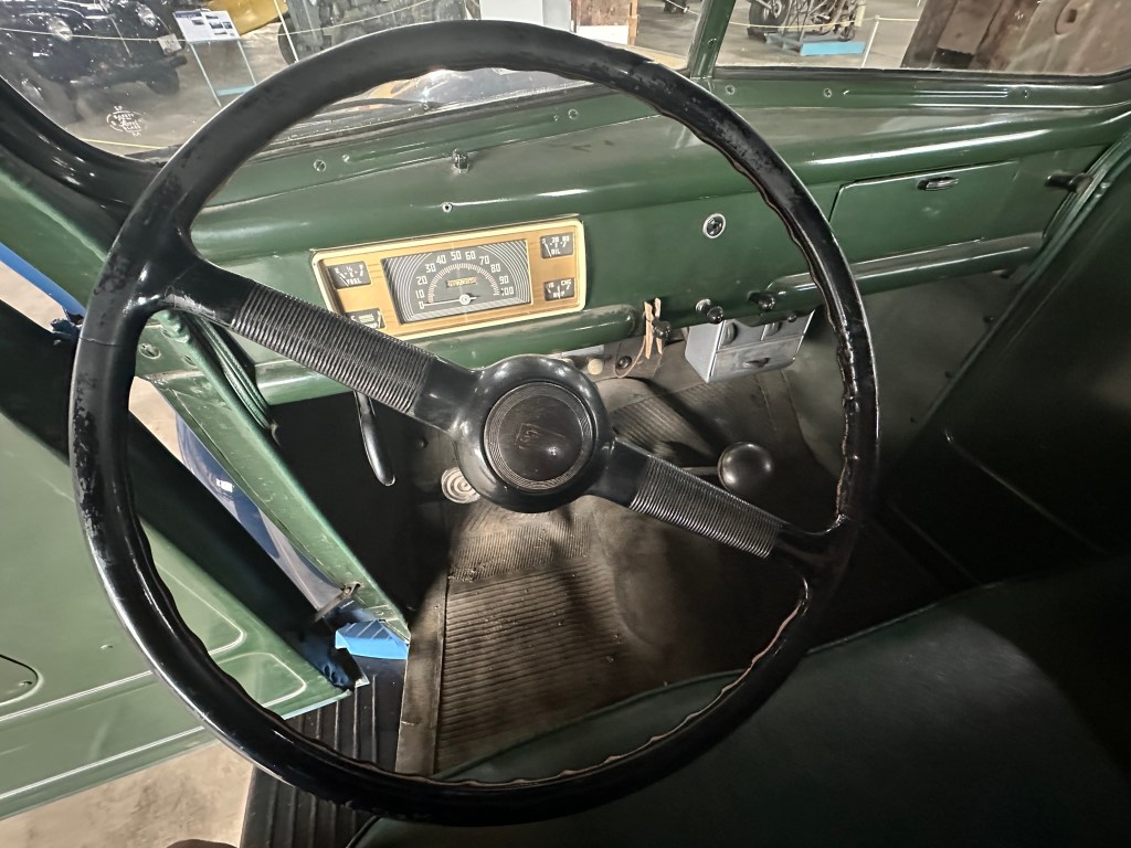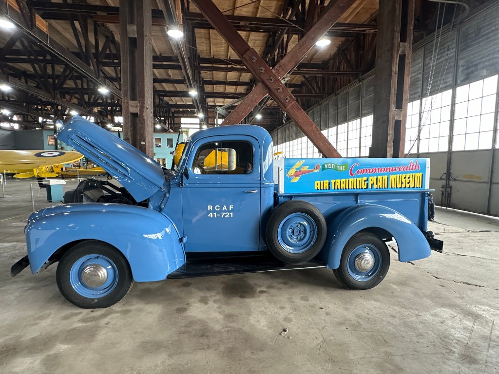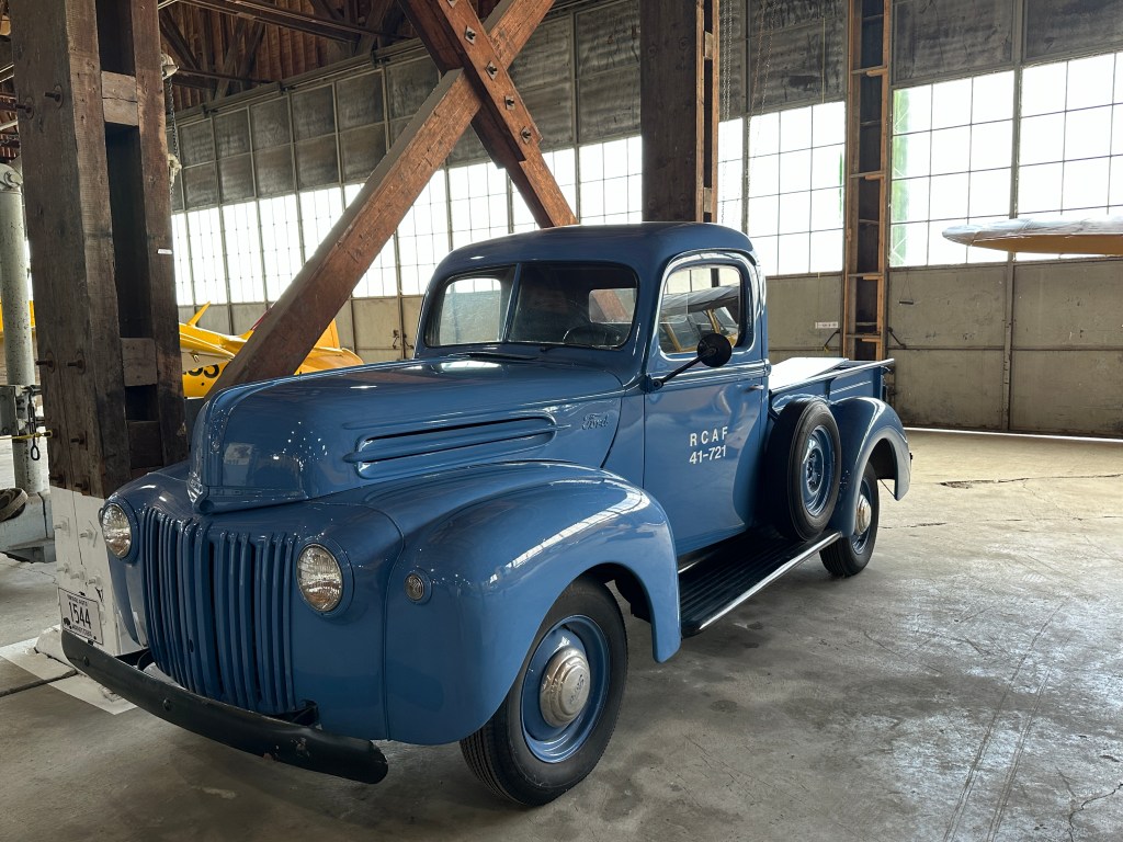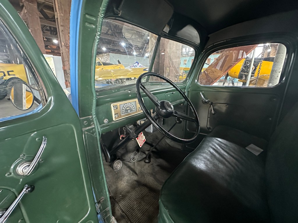 From 1942-47, Ford ½ ton trucks did not change much, there is some confusion as to the exact year of this excellent artifact. The information we have from the donor says that this is a 1943 Ford ½ ton pick-up. At the time, the design was known as ‘civilian pattern’, however, the only way a civilian could purchase one was if it was needed for an “essential” business or service. The trucks were painted green (as you can see from the photo of the interior) and the RCAF would repaint them. We are not sure where this truck served, however, ones like it did serve in the BCATP for general utility purposes. It is powered by a V-8 “flathead” engine with 85 HP. 1942-47 Ford trucks were built with a ladder type chassis with four cross members for strength. The Manufacturer’s suggested retail price for a truck like this in 1942 was $660*. This truck is in running condition.