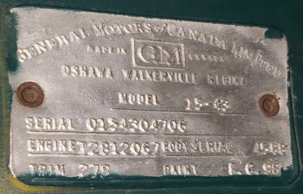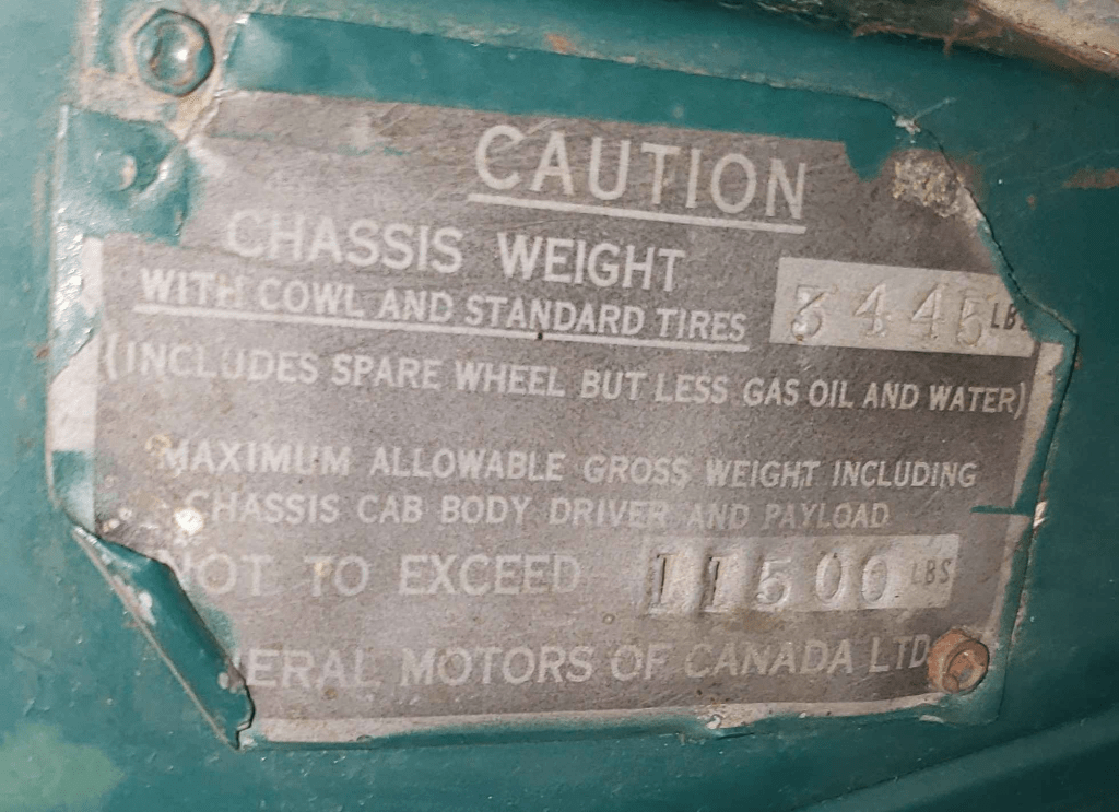 This Chevrolet is a Heavy-Duty Stake Express 1.5 -ton truck. The year of manufacture is unclear, according to the serial number, we believe it is 1940. We believe it was manufactured in Oshawa, Ontario and was available with or without the stakes and tailgate. It had a wheelbase of 158.5 inches. Below you can see the serial number tag and weight tag from this truck.