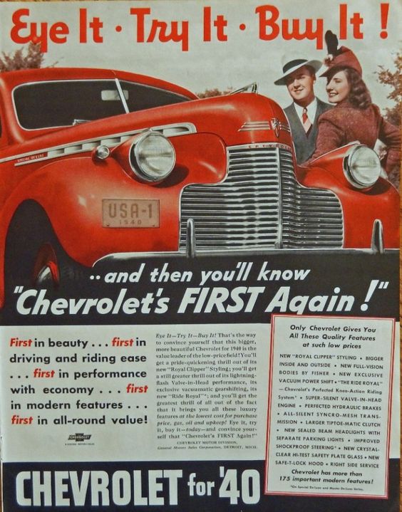 The standard engine on a 1940 Chevy was a 216.5 cubic inch in-line 6 cylinder which provided 85 horsepower. A 1940 ad for the car gives a base price of $659!
